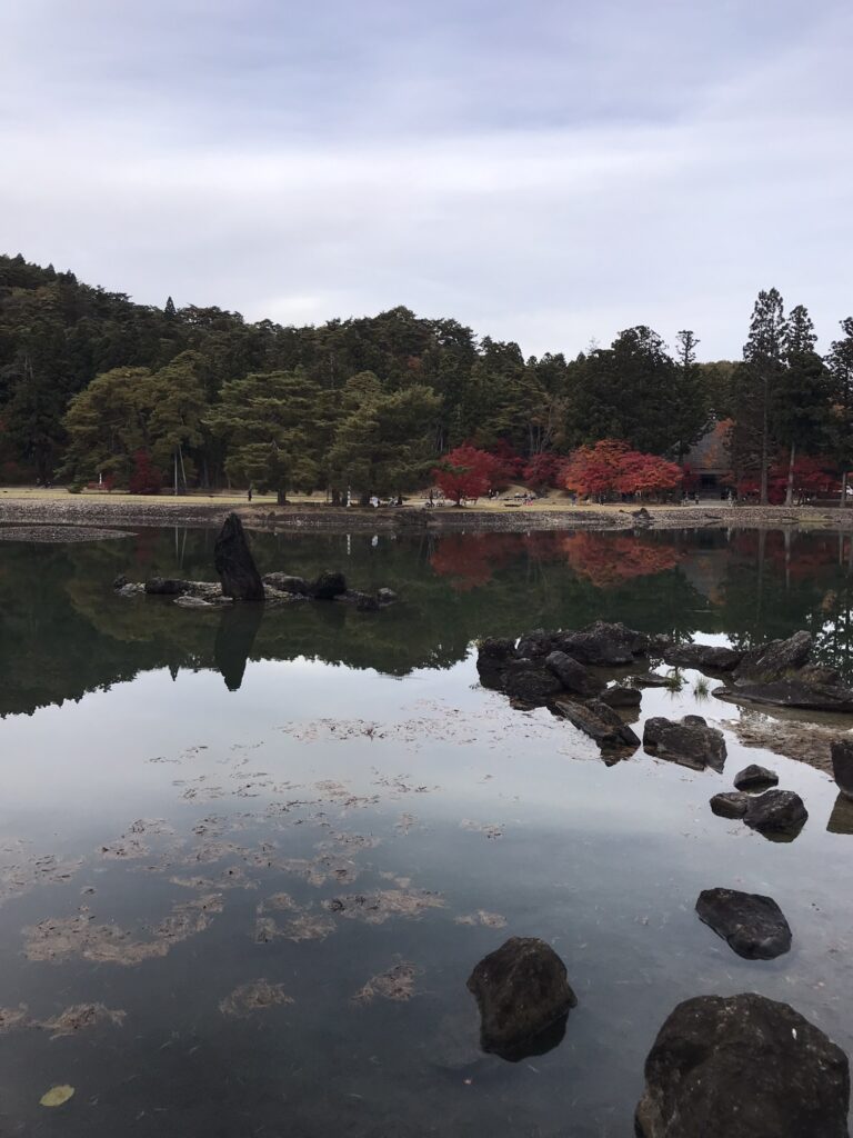When you’re finished in this area, retrace your steps back along the road into town and then continue north along Chusonji Street. On your left you will see the Muryoko-in Temple Site. This now-destroyed complex was typical of the Pure Land Buddhist temple design that Hiraizumi became known for. With their various islands, lakes, hills and green spaces, the temple gardens of this style were intended to represent a Buddhist ‘pure land’, a place of beauty, peace and tranquillity in order to create a paradise on Earth. These features can all be seen in the topographical layout of the former Muryoko-in site. The temple which once stood here was constructed by the third and penultimate Fujiwara lord, Hidehira, and was said to be aligned with the sunset over nearby Mount Kinkei on auspicious days of the year, creating a paradisiacal image. The buildings fell into ruin following the fall of the Fujiwaras and were eventually lost to time, with only the grounds remaining today. Exemplifying the Pure Land style despite the lack of any remaining structures, the Muryoko-in site is a component of the wider Hiraizumi UNESCO World Heritage Site.