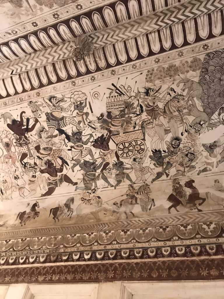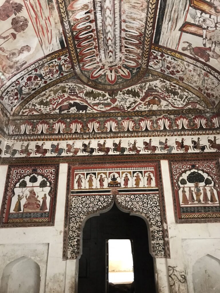 While the temple architecture is impressive, what stood out to us were the abundant painted walls and ceilings inside which included depictions of mythological demons and even some caricatures of British soldiers drinking wine. As with many of the other attractions in Orchha, you can climb to the top of the tower here for a great view.
