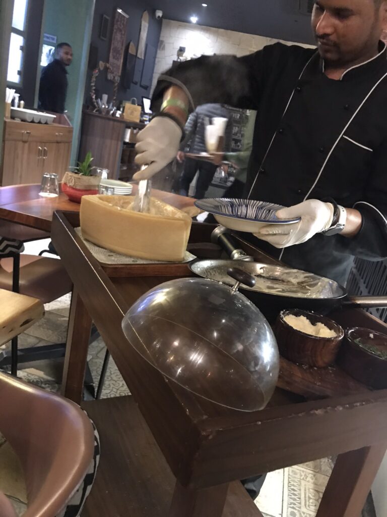 Oliver Bistro – a world-cuisine restaurant famous for serving pasta out of a parmesan wheel, with much flourish from the chef who wheels the cheese over on a platter and heats it with a blowtorch before lovingly tossing the pasta and coating with more parmesan. It’s a bit of a gimmick but some of the best pasta we had in India. There are not many tables, it seemed like quite an exclusive restaurant with a classy and refined ambiance. They even had a valet parking service.